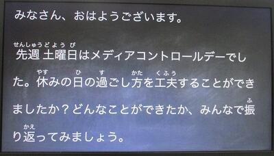 毎月15日は本校メディアコントロールデーです。取組を学校で振り返りです。今日から27日まで「家庭学習強化週間」です。読書の取組と併せてがんばりましょう!