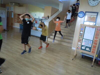 まずは地震避難訓練。頭を守りながら,「おはしも」を意識して避難しました。