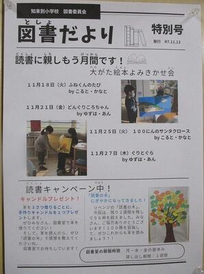 11月14日 図書委員会の取組 投稿: 教頭 (07:57) 「読書に親しもう月間」に図書委員会が頑張っています。来週からは図書委員による大型絵本の読み聞かせも企画されています。たくさん本を読もう!読解力をつけよう! 日増しに「葉」も増えています! 今朝の知来別は雪景色です。 Tweet -