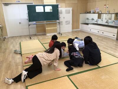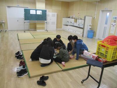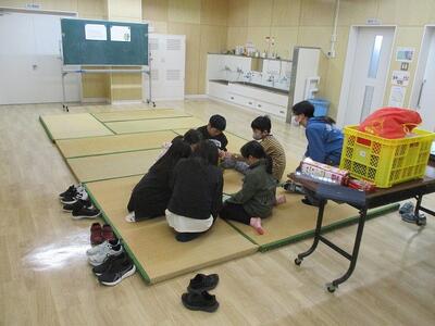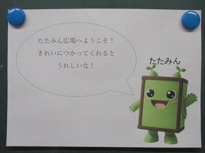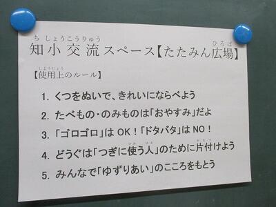 3学期から2階の廊下に「知小交流スペース(たたみん広場)」が誕生しました。たたみん広場の名のとおり、たたみが敷かれ、のんびりとくつろげるスペースになっています。中休み、昼休みにゲームをしたり談笑する児童の様子が見られます。