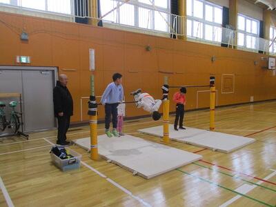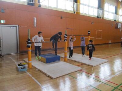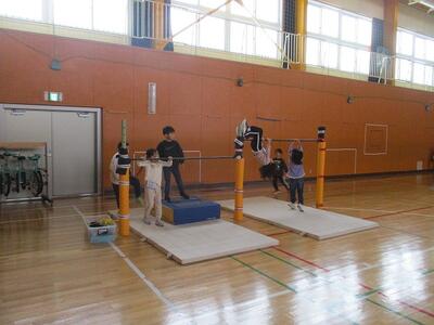 体育館に鉄棒を設置しています。休み時間や体育の授業で、先生の見守りのもと活用しています。