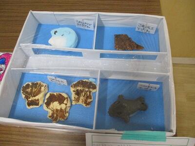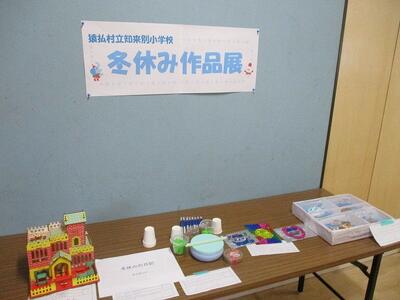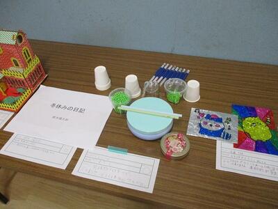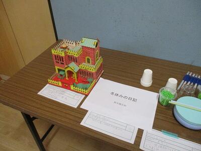 体育館前廊下には、冬休みに取り組んだ児童の作品を展示しています。紙粘土で作った水族館、自作した楽器、華やかなステンドグラス、冬休みの思い出を綴った日記、大作の模型と見応えがある作品が揃っています。