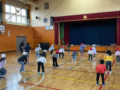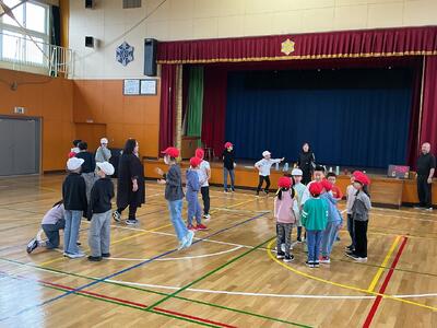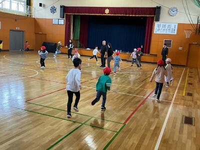1年生も加わっての1回目、鬼遊びで体育館を時間いっぱい走りました。